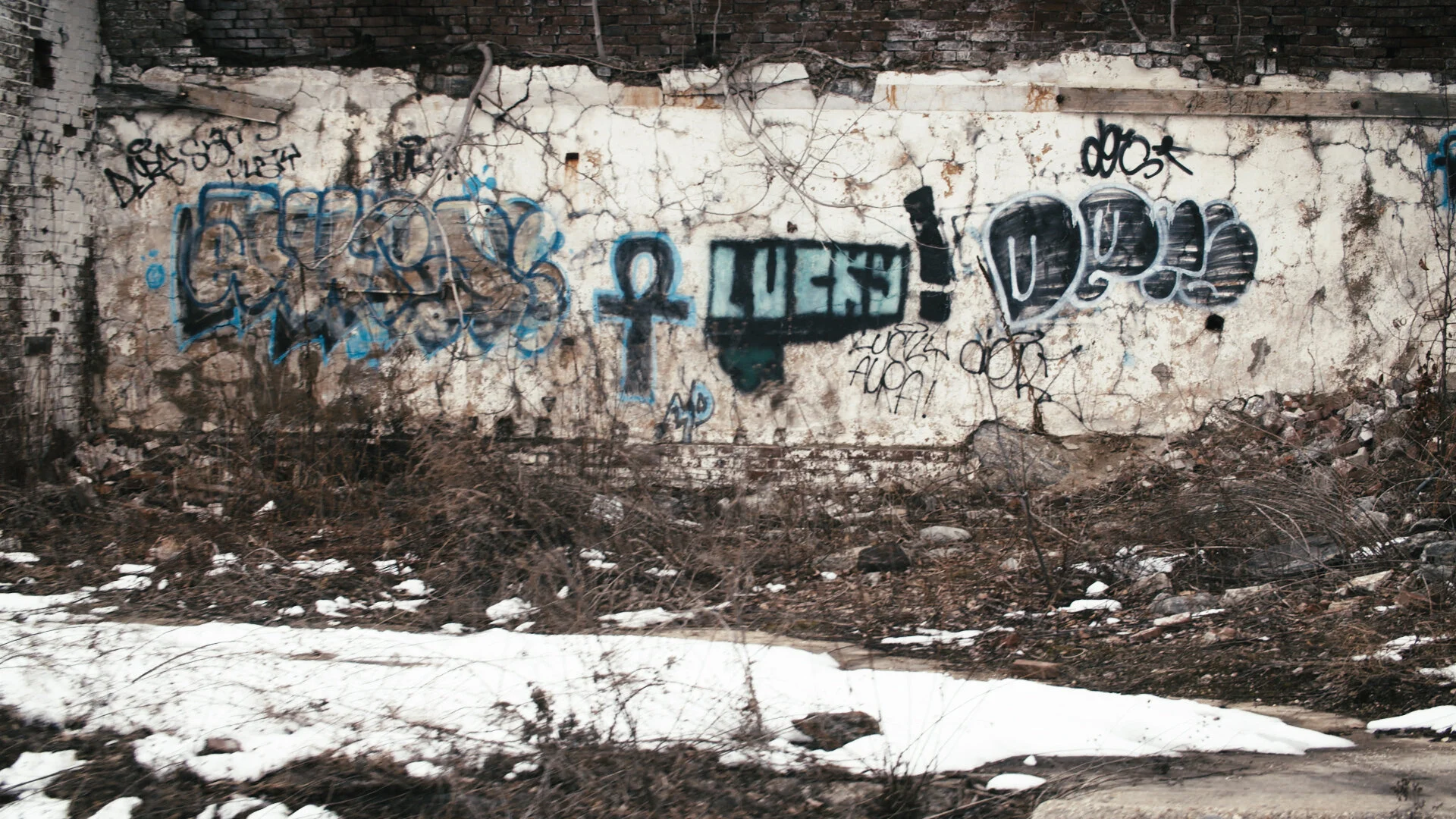 A montage of tags in an old mill section in downtown Lewiston, ME along the Androscoggin River.